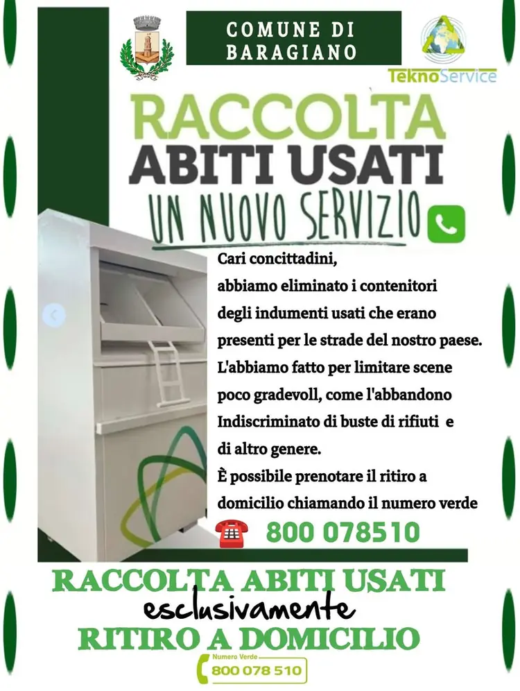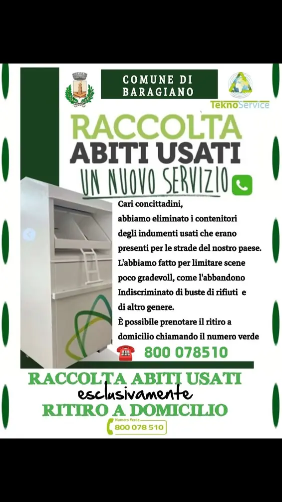 Cari concittadini, abbiamo eliminato i contenitori degli indumenti usati che erano presenti per le strade del nostro paese. L'abbiamo fatto per limitare scene poco gradevoll, come l'abbandono Indiscriminato di buste di rifiuti e di altro genere. È possibile prenotare il ritiro a domicilio ch